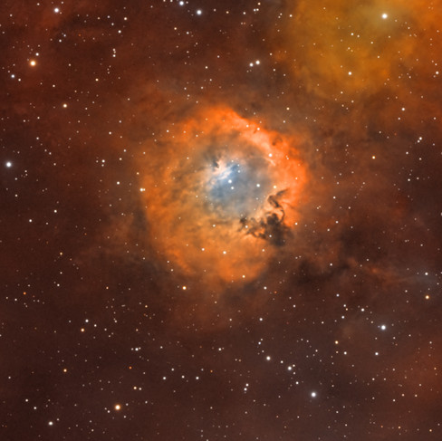 Above and right of that, we find the pair Sh2-168 and Sh2-169. The distances here are a little more certain with Sh2-168 landing at a distance of around 11,000 light years and Sh2-169 coming in much closer at a mere 7,500 light years.
