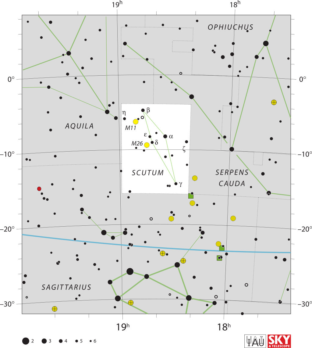 Scutum is a small constellation. Its name is Latin for shield, and it was originally named Scutum Sobiescianum by Johannes Hevelius in 1684. Located just south of the celestial equator, its four brightest stars form a narrow diamond shape. It is one of the 88 IAU designated constellations defined in 1922.