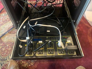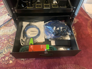 One thing, however, that is a constant pain in this astrophotography endeavor is matching up power cables. Most pieces of 12V gear use 5.5mm X 2.1mm plugs. Not the Alto-Giotto. It uses 5.5mm X 2.5mm plugs. A cable with a 2.1mm male end and a 2.5mm male plug at the other end is impossible to find. So I had to buy small adapters on Amazon for this. I truly wish the industry would standardize on one or the other. I don't care which. As for the external USB/12V power hub, I went with the Pegasus Pocket Powerbox Advance Gen 2. Pegasus has put out some dicey software updates lately. And I've seen a few of these die in the field. But overall, they've been reliable for me. The remainder of the gear for the rig included the enclosure, electronics, spare cables, spare parts, and specialized tools. I went with the same standard gig-rig enclosure I have on the TOA. As with the TOA's enclosure, I drilled two 2" holes—one at the top, and one at the bottom—for cable entry and exit. Then I installed a one fixed and a couple of extendable shelves and an enclosed drawer for the interior. Inside the enclosure, I mounted the control computer—yet another Intel NUC—and a small TPLink switch for connecting to the mount, the control computer, the infrastructure, and the remote power strip.